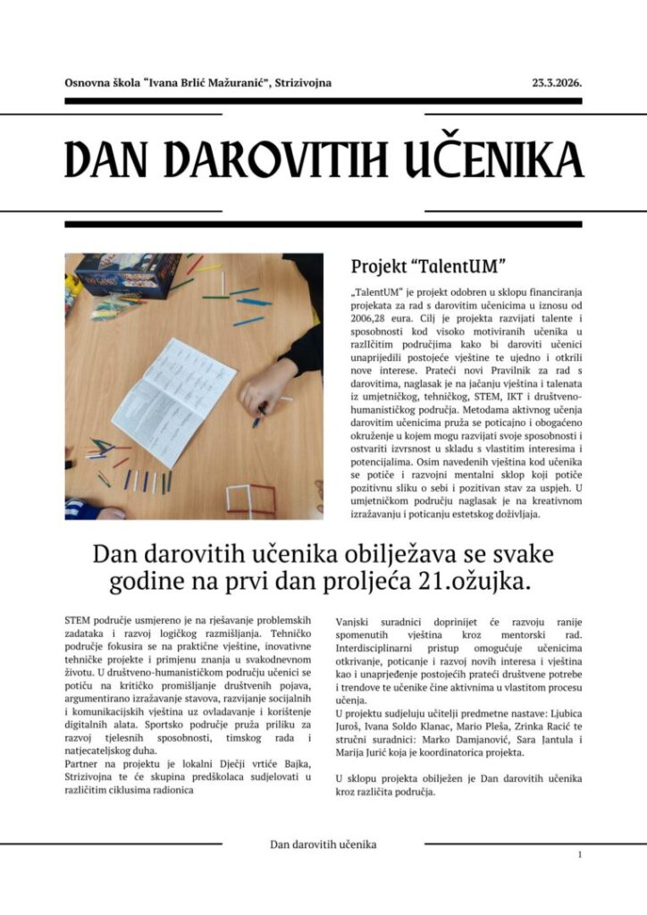 U sklopu projekta „TalentUM“ kojeg financira Ministarstvo znanosti, obrazovanja i mladih obilježen je Dan darovitih učenika koji se svake godine obilježava na prvi dan proljeća, 21. ožujka.