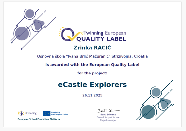Tijekom ljeta stigla nam je Nacionalna oznaka kvalitete za eTwinning projekt koji su se provodio u našoj školi. Nagrađeni projekt je provodila učiteljica povijesti Zrinka Racić s učenicima sedmih i osmih razreda. Projekt nosi naziv eCastle Explorers te su u njemu sudjelovali učenici i učitelji za Grčki, Turske, Italije, Njemačke, Španjolske, Portugala, Bugarske i Švicarske. U projektu su vrednovane sljedeće kategorije: suradnja škola, korištenje IKT-a, integracija aktivnosti projekta s kurikulumskim ishodima, pedagoške inovacije te evaluacija i diseminacija projekta.