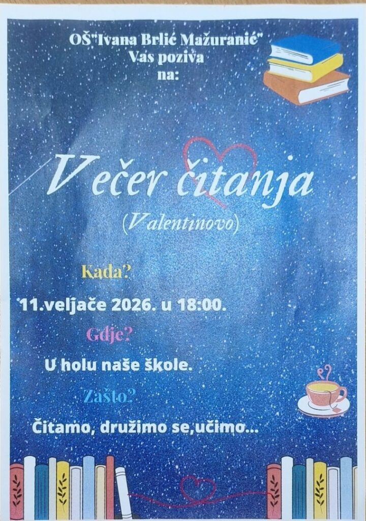 Prvo će se večeras održati večer čitanja u kojoj će se učenici naše škole družiti i čitati poeziju i prozu s uglavnom ljubavnom tematikom.